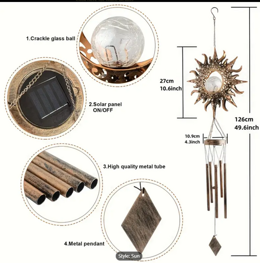 Solar Wind Chimes | Outdoor Sun Windchimes with Crackle Glass Ball Warm LED Light, Metal for Yard Patio Lawn Garden Hanging Decor | Gardening Gift for Women Mom