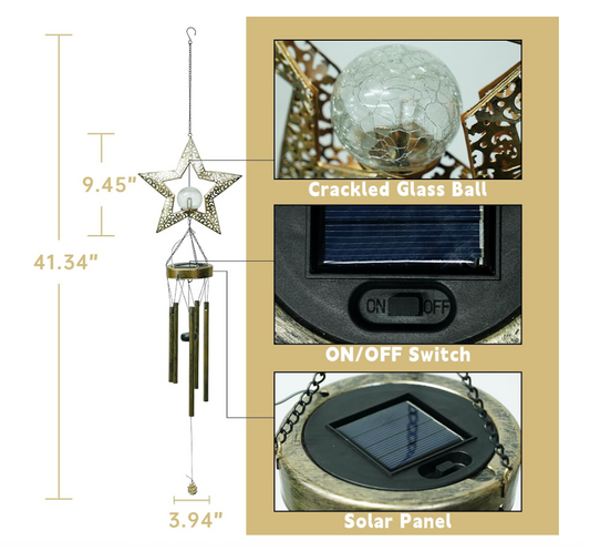 Ferrisland Solar Wind Chimes for Outside Clearance, Star Windchimes Outdoors for Porch Patio with Crackle Glass Ball LED Light, Waterproof Metal Outdoor Hanging Decor for Women Wife Mom Grandma